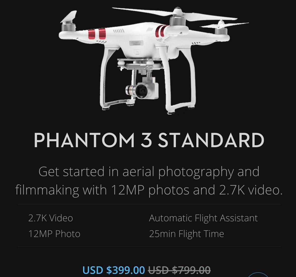 DJI Phantom 3 standard for sale pictureFinally, the entry level for the phantom brand offered by DJI is the Phantom 3 Standard perfect for anyone just getting started in aerial photography and film making. The drone has a 2.7K video camera and ability to take 12MP photos.