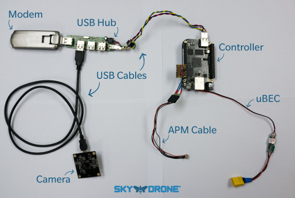 The quadcopter drone set up consists of a camera, modem mounted on top of the drone and the controller board which does all the work mounted on top.