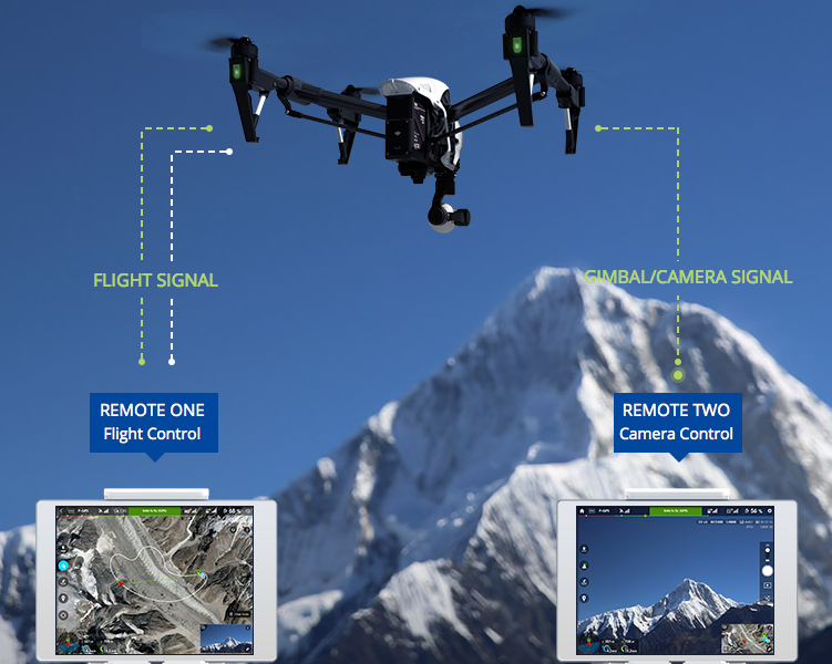 You can use two controllers with the DJI Inspire 1 to control the drone and the camera separately